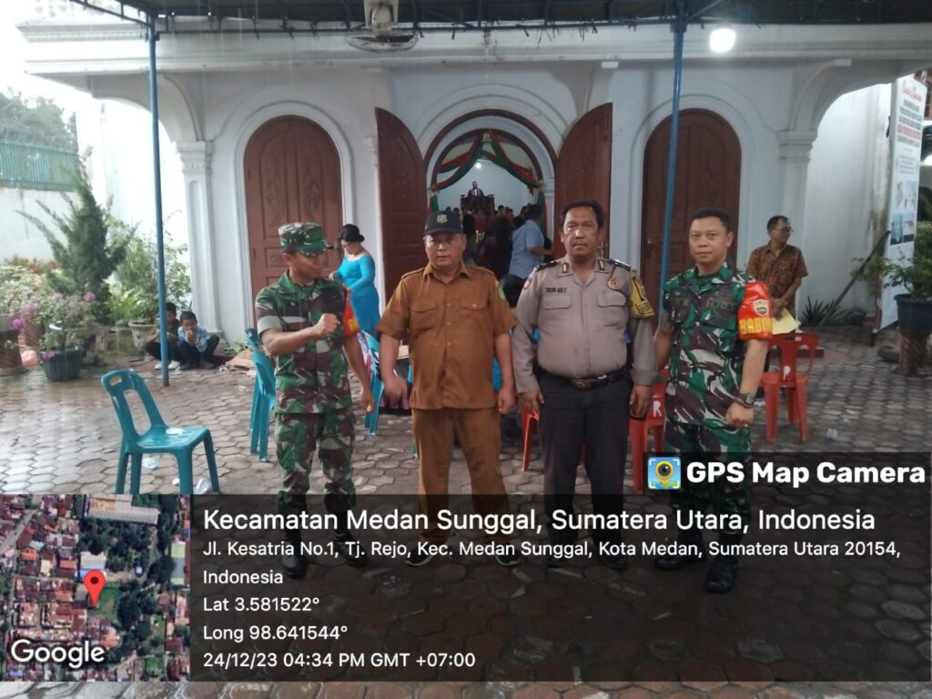 Medan- Babinsa Koramil 0201-06/MS,Kodim 0201/Medan Sertu Rokim dan Sertu Hasnul Wahyudi Selaku Babinsa Kel.Tj.Rejo memantau kegiatan Ibadah Natal di Gereja GBKP Jalan Kesatria Sunggal Link 4 Kel Tj Rejo kecamatan Medan Sunggal ,Minggu, (24/12/2023).