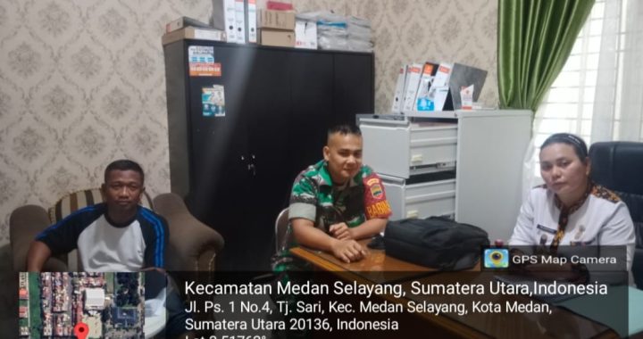 MEDAN.Babinsa Koramil 0201-07/MT Sertu Kasno Zeki melaksanakan kegiatan Komunikasi Sosial (Komsos) bersama Sekretaris Lurah dan