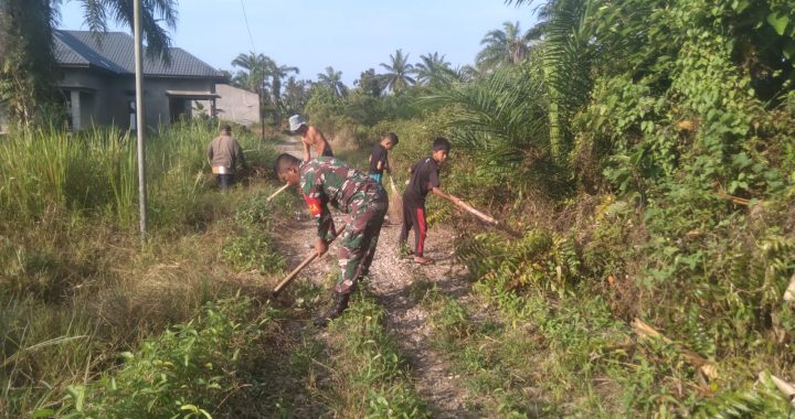 Babinsa Koramil 0201 12/Hamparan Perak Koptu Irwan Syahputra bersama warga masyarakat melaksanakan kegiatan membersihkan jalan