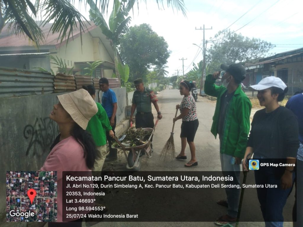 Pancur batu – Dalam Rangka mewujudkan lingkungan bersih dan kepedulian terhadap kesehatan, Babinsa Koramil 14/PB Kodim 0201/Medan Koptu Janawari bergotong royong bersama Perangkat desa,warga dan mahasiswa yang sedang melaksanakan kegiatan kuliah kerja nyata (KKN) membersihkan lingkungan di dusun 3 Desa Hulu Kecamatan pancur batu Kabupaten Deli serdang, Kamis (25/07/2024).