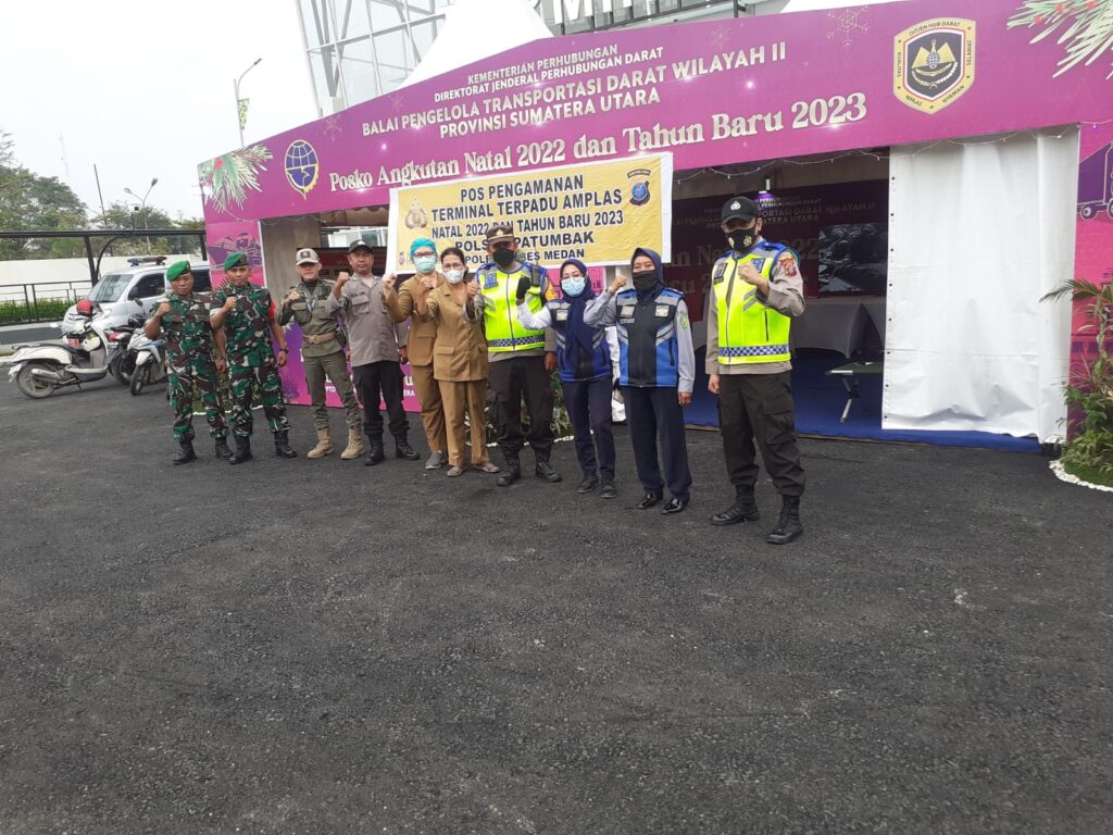 Medan Amplas – Dalam memberikan rasa aman dan nyaman pada pelaksanaan Natal dan Tahun Baru (Nataru), Babinsa Koramil 0201-08/MA Serma Wargono dan Serda A.Hasibuan bersama personil Polsek Patumbak, Satpol PP, Dishub dan Dinkes, melaksanakan siaga Pengamanan di Posko Nataru Terminal Amplas, Jalan Panglima Denai, Kelurahan Timbang Deli, Kecamatan Medan Amplas, Selasa (27/12/2022).