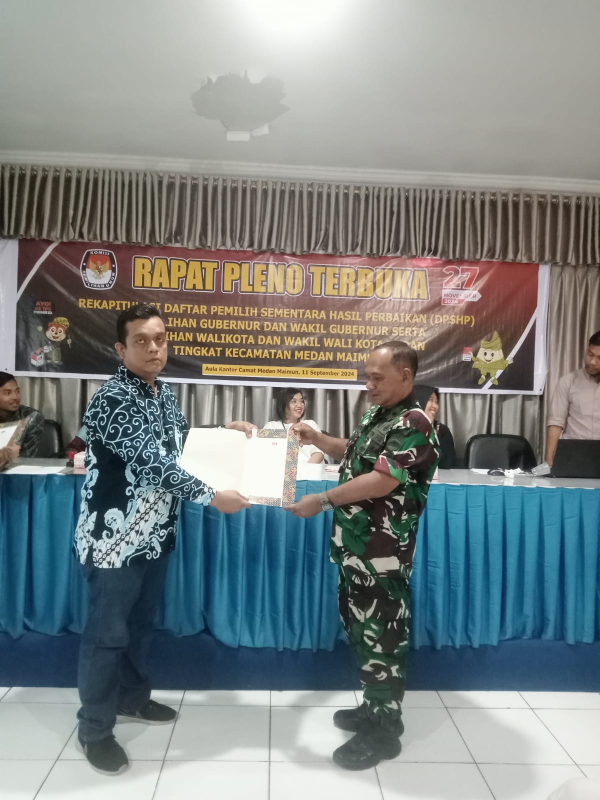 MEDAN | Danposramil Kecamatan Medan Maimun Peltu MP. Sitepu menghadiri acara Rapat Pleno Terbuka Rekapitulasi Rekapitulasi Daftar Pemilih Sementara Hasil Perbaikan (DPSHP) Tingkat Kecamatan Pada Pemilihan Gubernur dan Wakil Gubernur, Wali Kota dan Wakil Wali Kota Tahun 2024 bertempat di Aula Kantor Camat Medan Maimun, Rabu (11-09-2024).