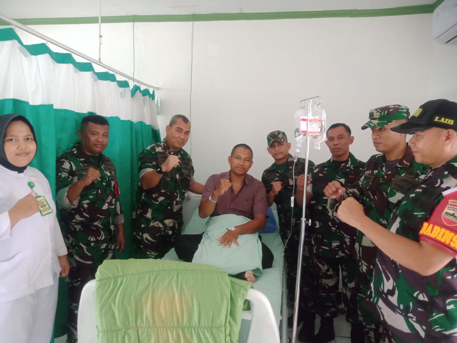 Danramil 0201-01/MP Kapten Inf. Sabur Utomo beserta anggota Babinsa melakukan kunjungan ke Rumah Sakit Tentara (RST) Putri Hijau di Jalan Putri Hijau, Kelurahan Kesawan, Kecamatan Medan Barat. Kunjungan ini bertujuan untuk menjenguk Serma Isman Nuriadi yang sedang menjalani perawatan akibat sakit.