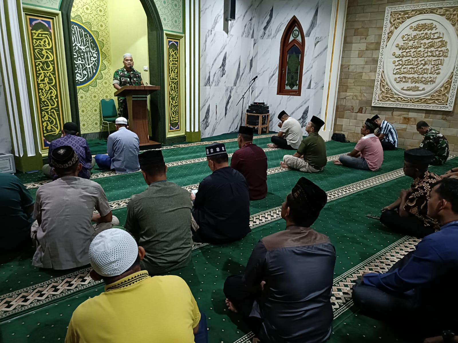 Medan.Komandan Koramil 0101-06/MS,Kodim 0201/Medan Kapten Inf AM Marpaung memberikan Tausyah keagamaan kepada anggota dan jamaah mesjid Alhidayah Makodim 0201/Medan Jalan Pengadilan Kec.Medan Petisah, Selasa (26/3/2024).