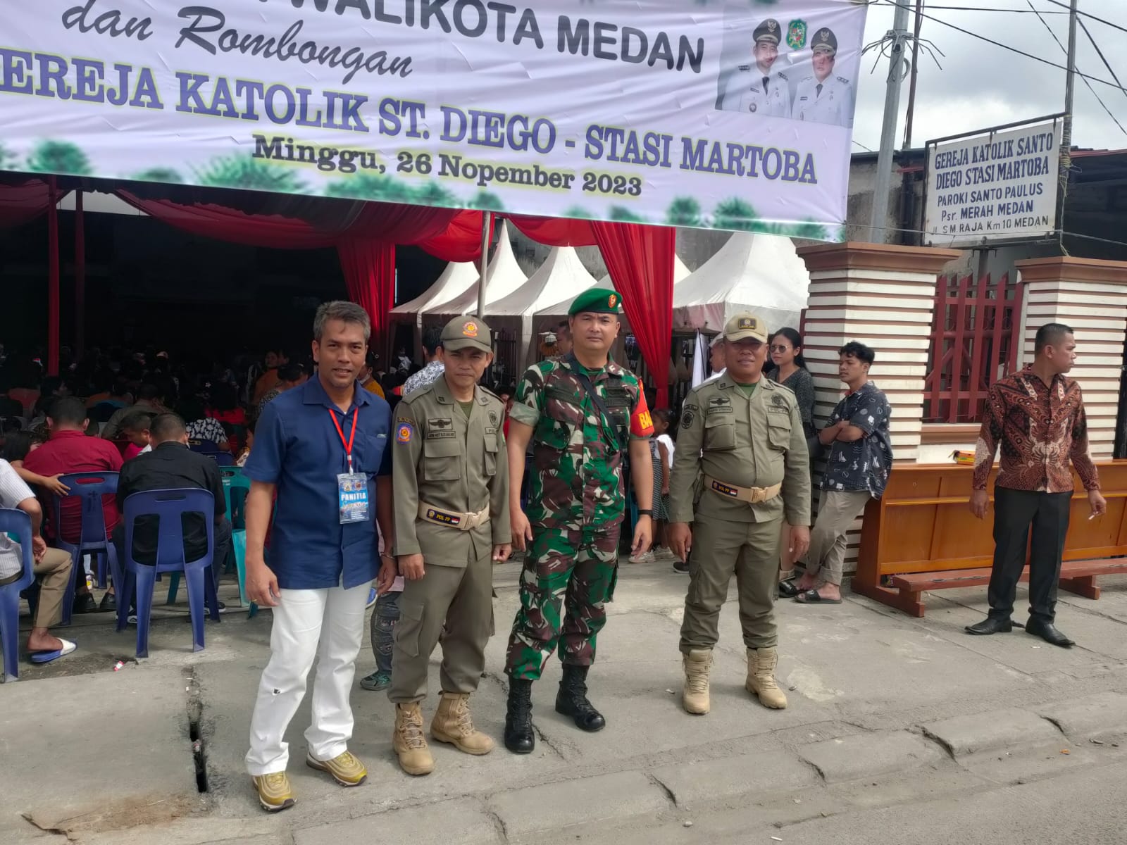 Medan : Komandan Koramil 0201-08/MA jajaran Kodim 0201/Medan Kapten Arh Henry Johan Nainggolan bersama Babinsa memonitor dan menghadiri Acara Safari Natal Pemko Medan di Gereja Katolik ST Diego Stasi Martoba Jalan Sisingamangaraja, Kelurahan Timbang Deli, Kecamatan Medan Amplas, Minggu 26 November 2023.