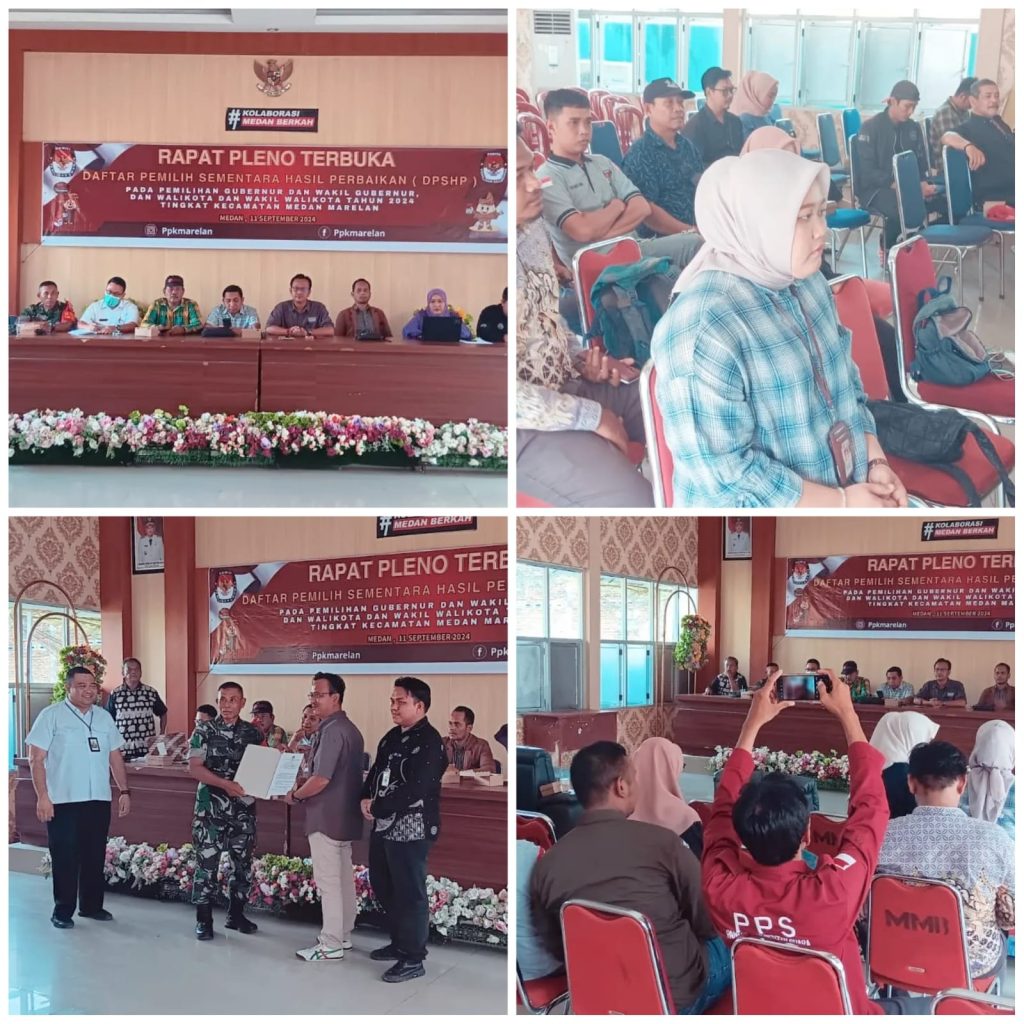 Rapat Pleno Terbuka Daftar Pemilih Sementara Hasil Perbaikan (DPSHP) tingkat kecamatan di Kantor Camat Medan Marelan Jln.Kapten Rahmabuddin Kelurahan Terjun Kecamatan Medan Marelan dihadiri Danramil 0201-10/MM Kapten inf.Rahimin.(Rabu 11 September 2024).