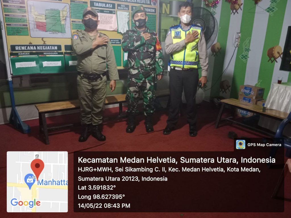 Bersama tim gabungan Serka DP Pasaribu dan Serda JA Purba Babinsa Koramil 07/Medan Tuntungan Kodim 0201/Medan melaksanakan pengamanan Pos Pam Mudik Lebaran 1443 H tahun 2022 di Pos Pam Manhattan jalan Asrama kecamatan Helvetia Sumatera Utara. Sabtu (14/05/2022).
