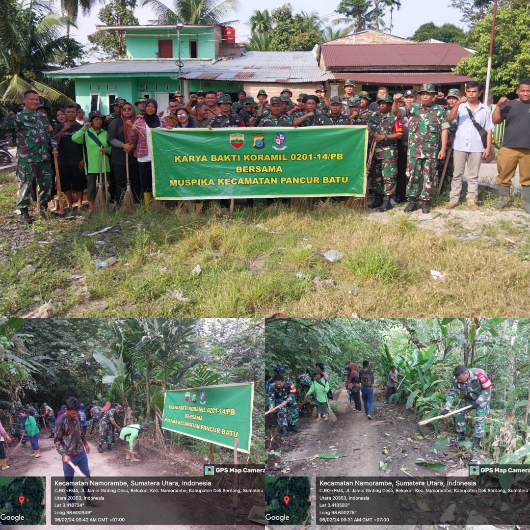 Seperti halnya yang dilakukan Anggota Koramil 0201-14/PB Kodim 0201/Medan yang ikut melaksanakan kegiatan gotong royong bersama warga di Dusun 3 Desa Tiang Layar Kecamatan Pancur Batu Kabupaten Deli Serdang, dalam membersihkan area jalan warga dan parit parit aliran air di kiri kanan jalan, Selasa (06/02/2024).