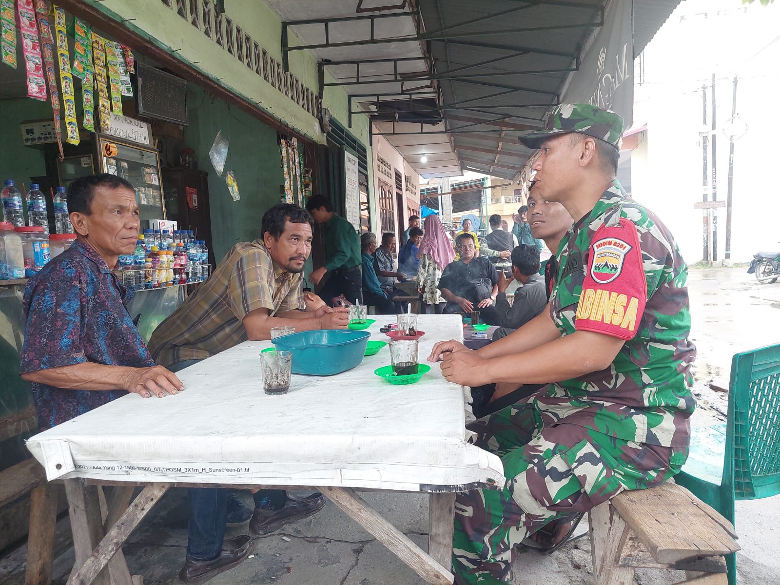 Koordinasi selalu dilaksanakan bersama guna mewujudkan kesepakatan kegiatan yang berhubungan untuk kepentingan masyarakat dalam kegiatan Komsos tersebut Babinsa sambangi warga yang sedang duduk di warung kopi ibu marina.