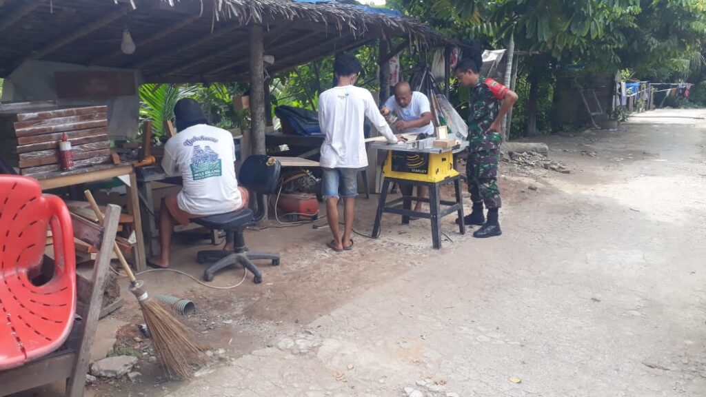 Demikian hal nya yang dilakukan oleh Babinsa Sertu Susanto, sudah menjadi kegiatan rutin dalam melakukan komunikasi di wilayah binaan. Pada kali ini mengunjungi kampung pancasila yang mana terlihat para warga tersebut sedang semangat berkreatif dalam bekerja membuat kursi dan meja.