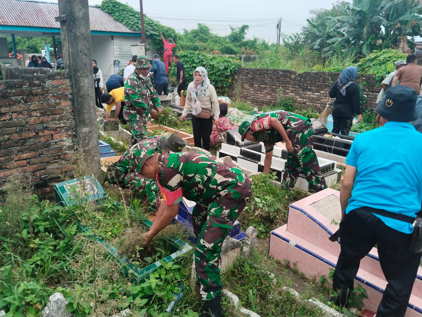 MEDAN 05/MB | Dalam rangka menyambut datangnya bulan suci Ramadhan, Babinsa Koramil 0201-05/MB Kodim 0201/Medan dipimpin Danposramil Medan Polonia Peltu M Basri Nasution melaksanakan kegiatan Karya Bakti gotong royong massal bersama Muspicam Medan Polonia dan warga membersihkan Pemakaman Wakaf Muslim di Jl. Karya Sejati, Lingkungan V, Kelurahan Polonia, Kecamatan Medan Polonia.