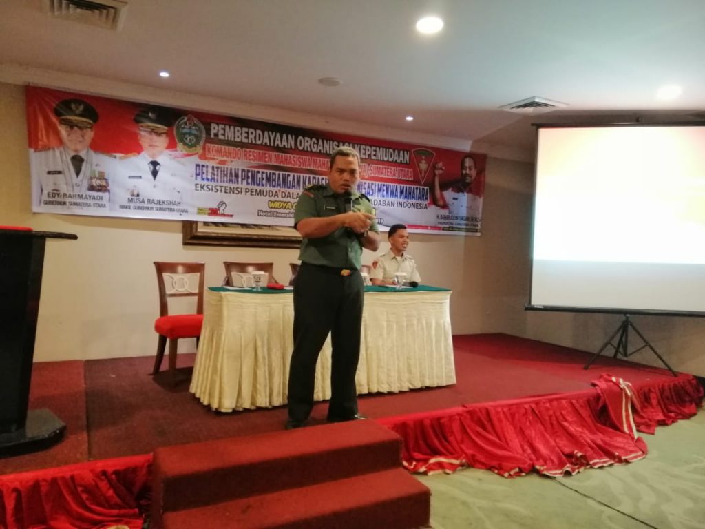 Kaur Bhakti Kodim 0201/BS, Kapt Inf. AM Marpaung memberikan materi Wawasan Kebangsaan kepada Resimen Mahasiswa Provsu, Kamis 10/10/19 di Emeral Garden Hotel Jl. Yos Sudarso Medan.