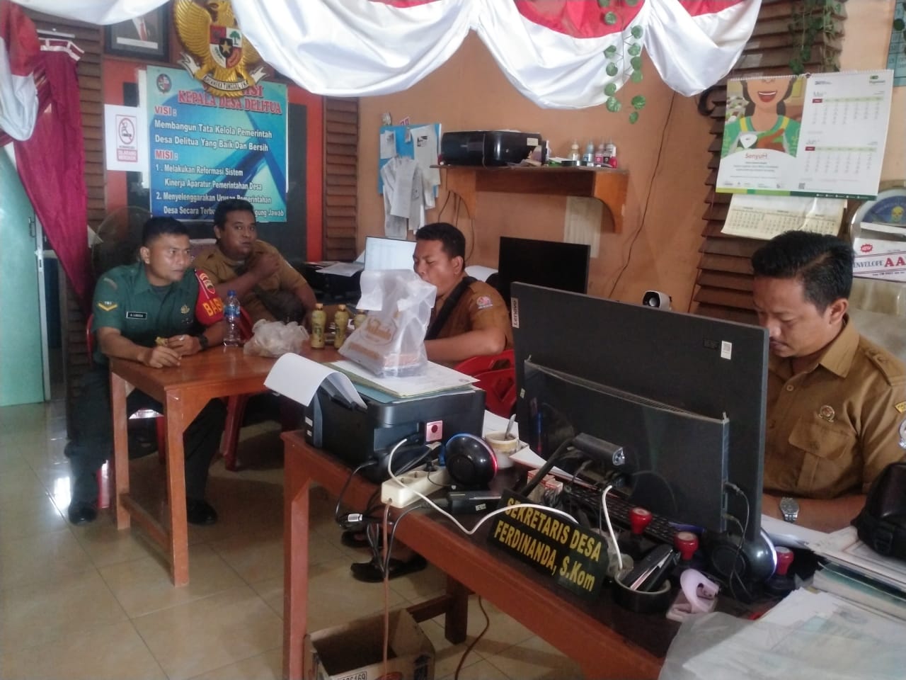 NAMORAMBE— Guna menjalin kemanunggalan TNI dengan Rakyat, Babinsa Koramil 14/PB Kodim 0201/Medan Serda Ade Lingga melaksanakan Komsos bersama Aparatur Pemerintahan Desa, bertempat di Kantor Desa Deli Tua,