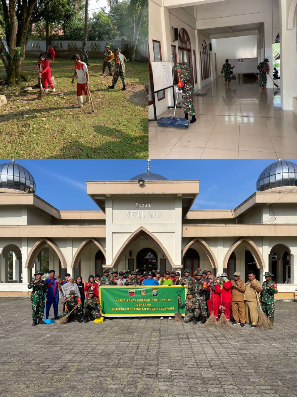 Koramil 0201-07/MT bersama Aparatur kelurahan dan warga Lakukan Karya Bakti Pembersihan Tempat ibadah Masjid Nurul Iman di jln. Penerbangan I Kel Sempakata Kec. Medan Selayang.
