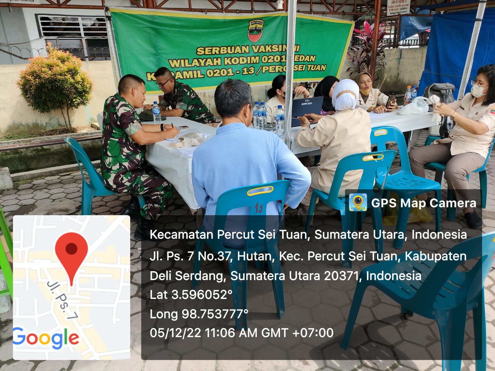 Percut Sei Tuan – Koramil 0201-13/PST kembali layani masyarakat dengan gencarkan program Serbuan Vaksinasi untuk masyarakat yang belum Vaksin 1, 2 dan 3 Boster, Vaksin tersebut ditujukan kepada masyarakat Kecamatan Percut Sei Tuan yang berusia 18 tahun keatas pada hari Senin 5 Desember 2022 dilaksanakan di Halaman Masjid Al Firdaus Jln Besar Medan Batang Kuis Desa Bandar Klippa, Kec Percut Sei Tuan