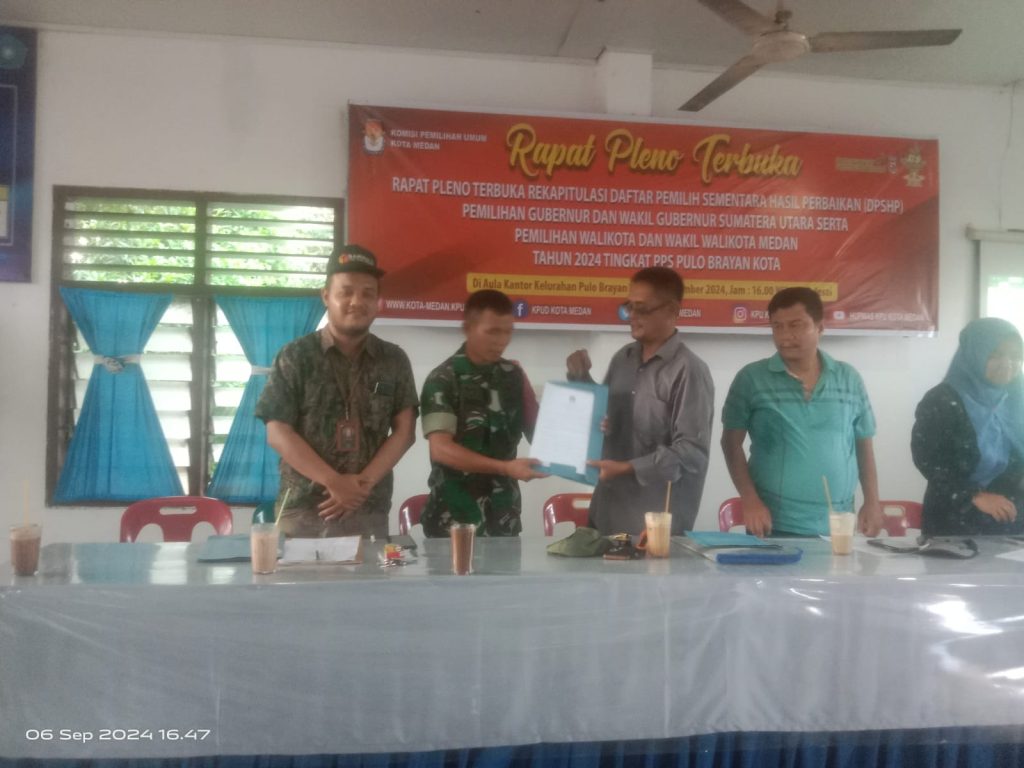 Pulo Brayan Kota, 12 September 2024 – Sertu J. Sidabutar, anggota Babinsa Kodim 0201-01/MP setempat, mengikuti undangan rapat Pleno Terbuka rekapitulasi Daftar Pemilih Sementara Hasil Perbaikan (DPSHP) yang berlangsung di Aula Kantor Lurah Pulo Brayan Kota.