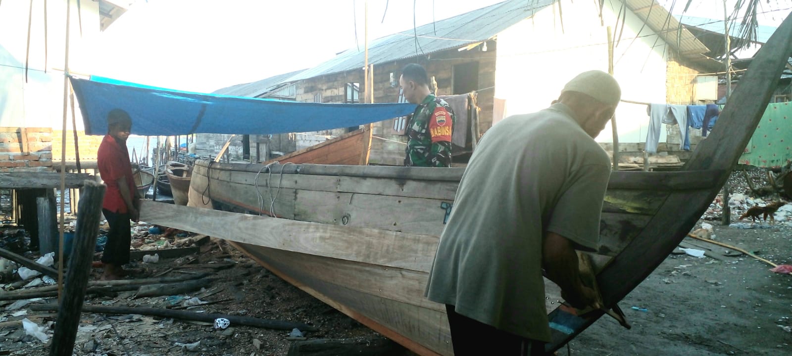 Babinsa koramil 0201-12 HP Sertu Achyaris melaksanakan komsos bersama Bapak Hamzah yg sedang memperbaiki kapal, bapak hamzah ini merupakan nelayan yang beralamat di Dusun 3 Desa Karang gading kec.labuhan deli kabupaten deli serdang . (Rabu 07 Februari 2024)