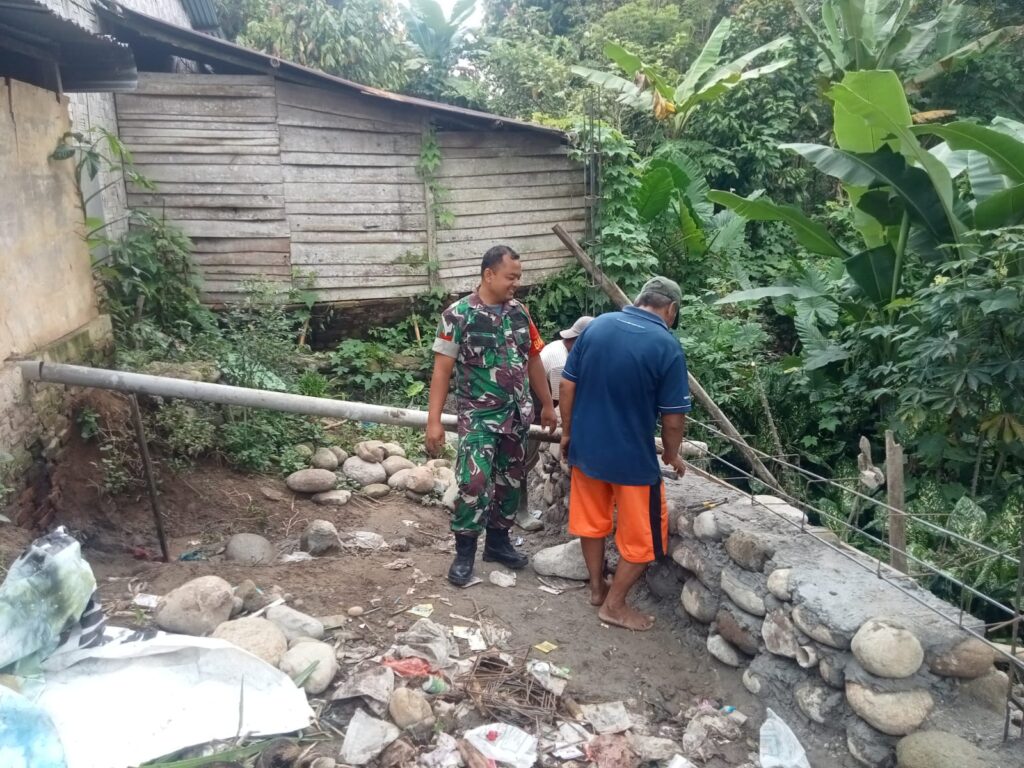 dalam menjalin keakraban Babinsa Melaksanakan Komsos dengan Warga binaan dibelakang rumah BPK ramson Sembiring yg sedang pembangunan pondasi rumahy untuk mencegah longsor tanahny desa lomulgap Kec.Namorambe Kab.deli serdang, Minggu (05-11-2023).