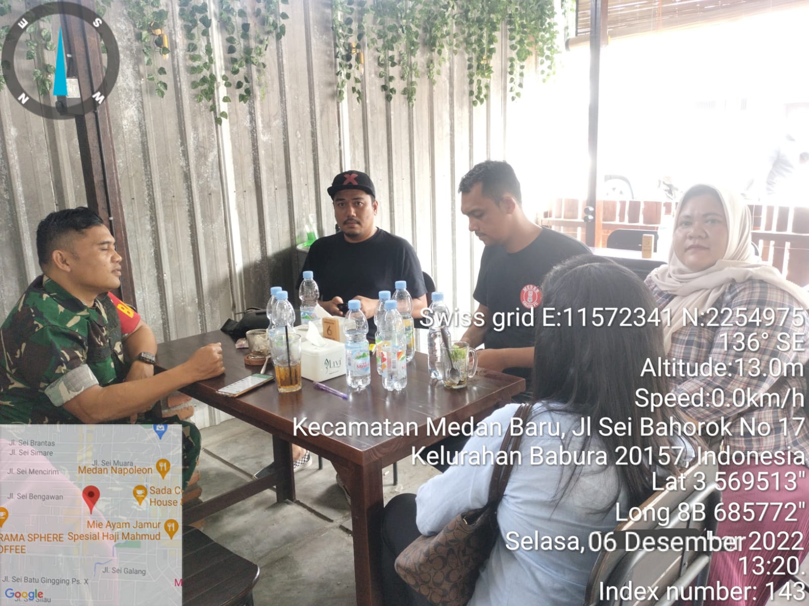 MEDAN 05/MB | Babinsa Kelurahan Babura, Koramil 0201-05MB jajaran Kodim 0201/BS Kota Medan, Serda Rudi Sinambela melaksanakan komunikasi sosial atau Komsos bersama para pemuda membahas tentang bahaya miras dan narkoba di salah satu kedai kopi di kawasan Kelurahan Babura Kecamatan Medan Baru.