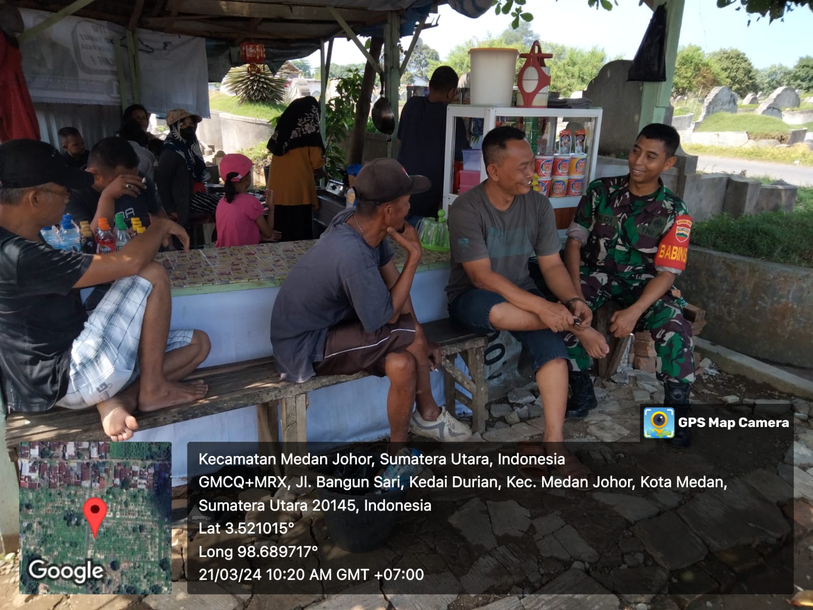 Medan : Meskipun sedang menjalankan ibadah Puasa Babinsa Koramil 0201-08/MA Kodim 0201/Medan Sertu Dedi melaksankan Komunikasi Sosial (Komsos) untuk Menjaga silaturahmi dengan warga binaan sekaligus memantau perkembangan situasi wilayah selama bulan suci Ramadhan bertempat di Jalan Bangun Sari, Kelurahan Kedai Durian, Kecamatan Medan Johor, Kamis (21/03/2024).