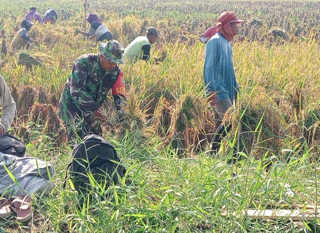 Mendukung program Hanpangan Babinsa ikut memanen padi bersama para petani