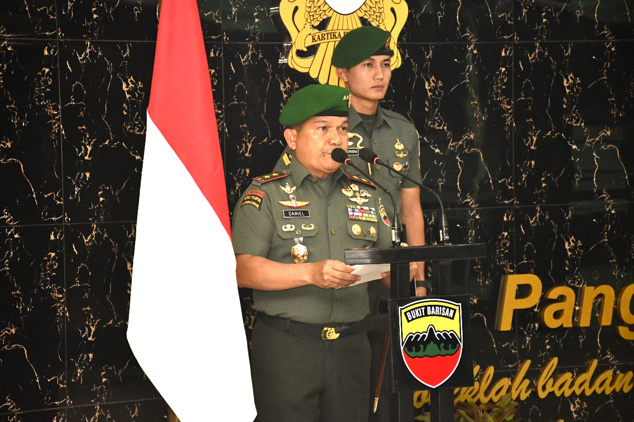 Medan – Pangdam I/BB, Mayjen TNI Achmad Daniel Chardin, SE, MSi, memimpin acara laporan korps kenaikan pangkat Perwira Kodam I/ Bukit Barisan periode 1 Oktober 2022 di Gedung AH Nasution Makodam I/BB, Sabtu (1/10/2022).
