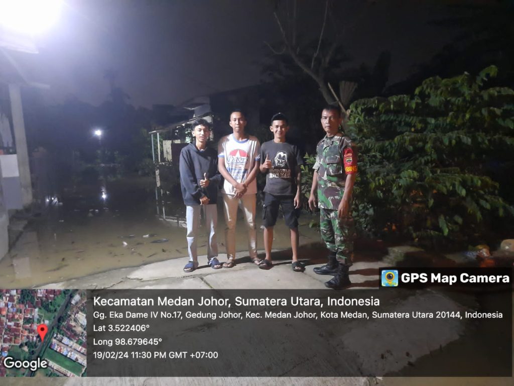 Babinsa Koramil 0201-08/MA jajaran Kodim 0201/Medan Serma Edy Syahputra melaksanakan pemantauan sungai deli dalam rangka kesiapan Babinsa dalam antisipasi bencana banjir di wilayah binaan. Pemantauan yang dilakukan berlokasi di Jalan Eka Dame, Kelurahan Gedung Johor, Kecamatan Medan Johor, Senin 19 Februari 2024 (Malam).