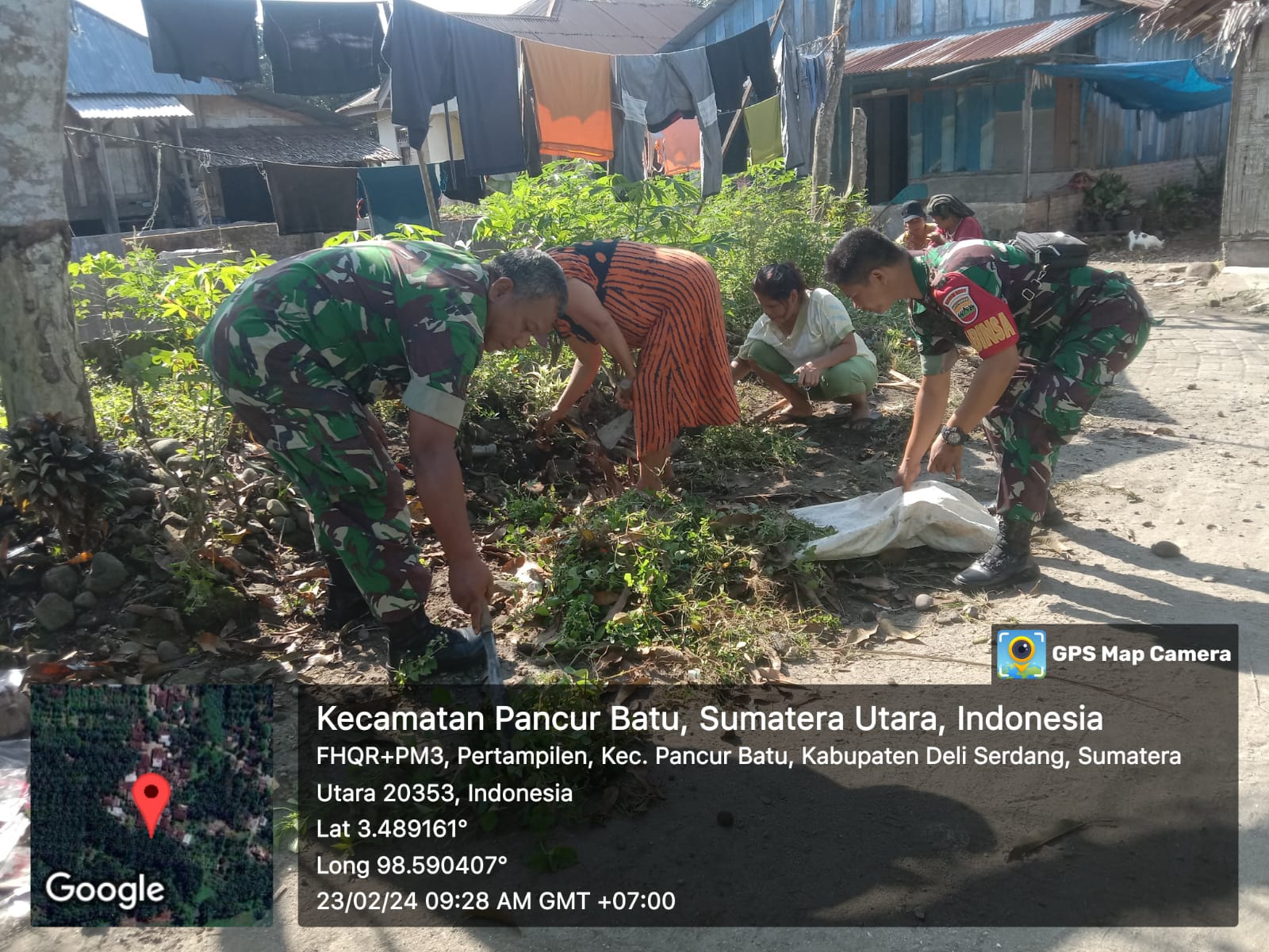 PANCUR BATU – Anggota Koramil 14/Pancur Batu Serda Agus Edy Syahputra,Serda Agustiar dan Serka Jumiko jajaran Kodim 0201/Medan melaksanakan kegiatan gotong royong bersama masyarakat di desa Durin Jangak kec Pancur Batu Kab Deliserdang, Jumat(23/02/24).