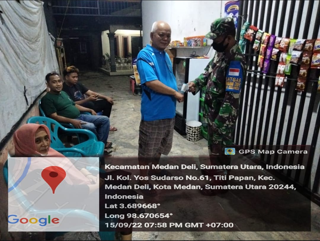 Medan – Upaya memutus penyebaran Virus Covid 19 di wilayah kecamatan Medan deli, anggota Koramil 0201-11/Medan Deli Babinsa Sertu Rudi Apriyanto melaksanakan himbauan dan mengajak warga untuk selalu menerapkan protokol kesehatan di masa PPKM Mikro, hal itu dilakukan untuk memutus penyebaran Covid 19 di wilayah teritorial Koramil 0201-11/MD Kodim 0201/Medan, kegiatan itu dilakukan di sekitar jln. Yos Sudarso Kel. Titipapan kec. Medan deli, kamis (15/09/2022)