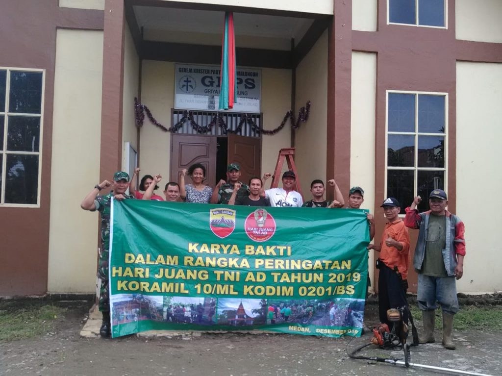 Gotong royong dalam rangka memperingati Hari Juang TNI AD, dilaksanakan oleh personel jajaran Koramil 10/ML. Karya bakti diadakan di Gereja GKPS Jalan Tuar Indah 9 Blok 7 Griya Martubung, Kel Besar.