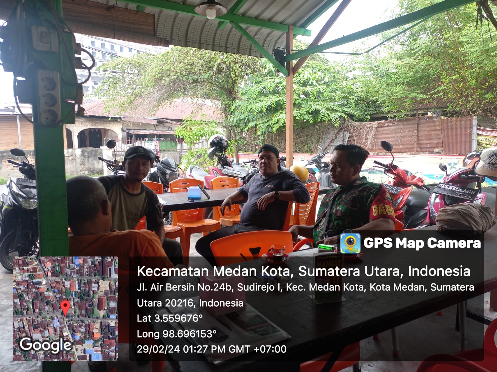 Medan Kota- Babinsa Kelurahan Sudirejo I Serma A. Saragih bersama Kepling Komsos dengan Warga binaan bertempat di Warung Mangat Kuphi Jl. Air Bersih no. 24 Kel. Sudirejo I Kec. Medan Kamis (29-02-2024)