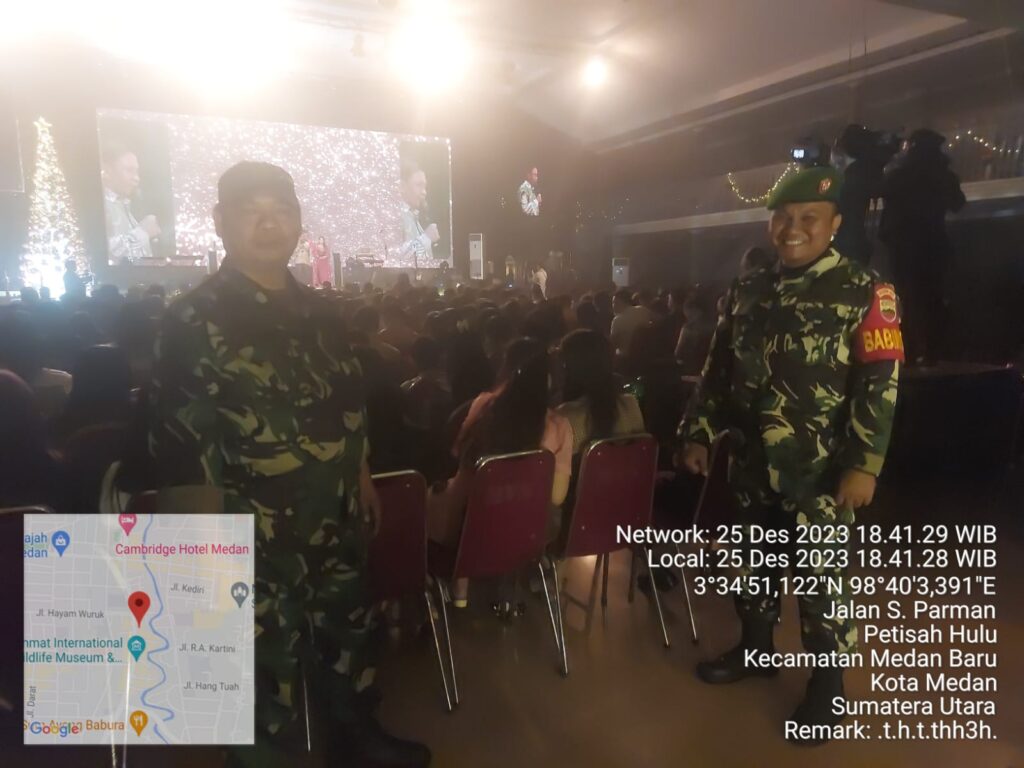 MEDAN | Beri kelancaran dan kenyamanan Babinsa Koramil 0201-05/MB, Kodim 0201/Medan melaksanakan Pengamanan dan monitoring kegiatan Ibadah Natal Tahun 2023 di Gereja HKBP Sudirman Jl. Jenderal Sudirman No 17 Medan Kelurahan Jati, Kecamatan Medan Maimun.