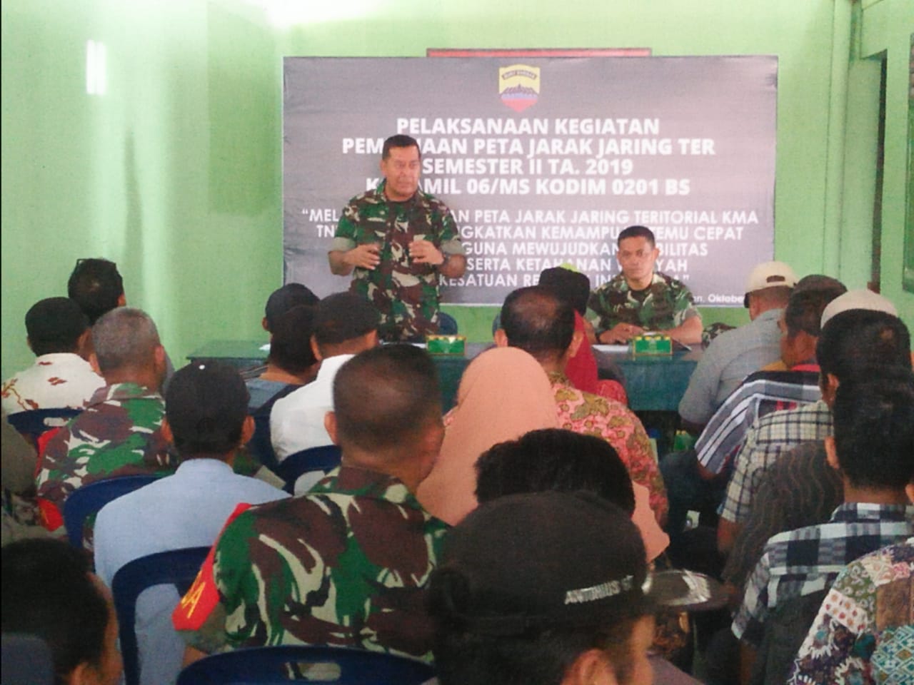 Untuk meningkatkan sinergitas seluruh komponen masyarakat guna memperkokoh integritas bangsa dan sebagai wujud pembinanan mitra karib komando kewilayahan, Koramil 06/MS Kodim 0201/BS, melaksanakan sosialisasi Pembinaan Peta Jarak Jaring Teritorial, Rabu (16/10/2019).