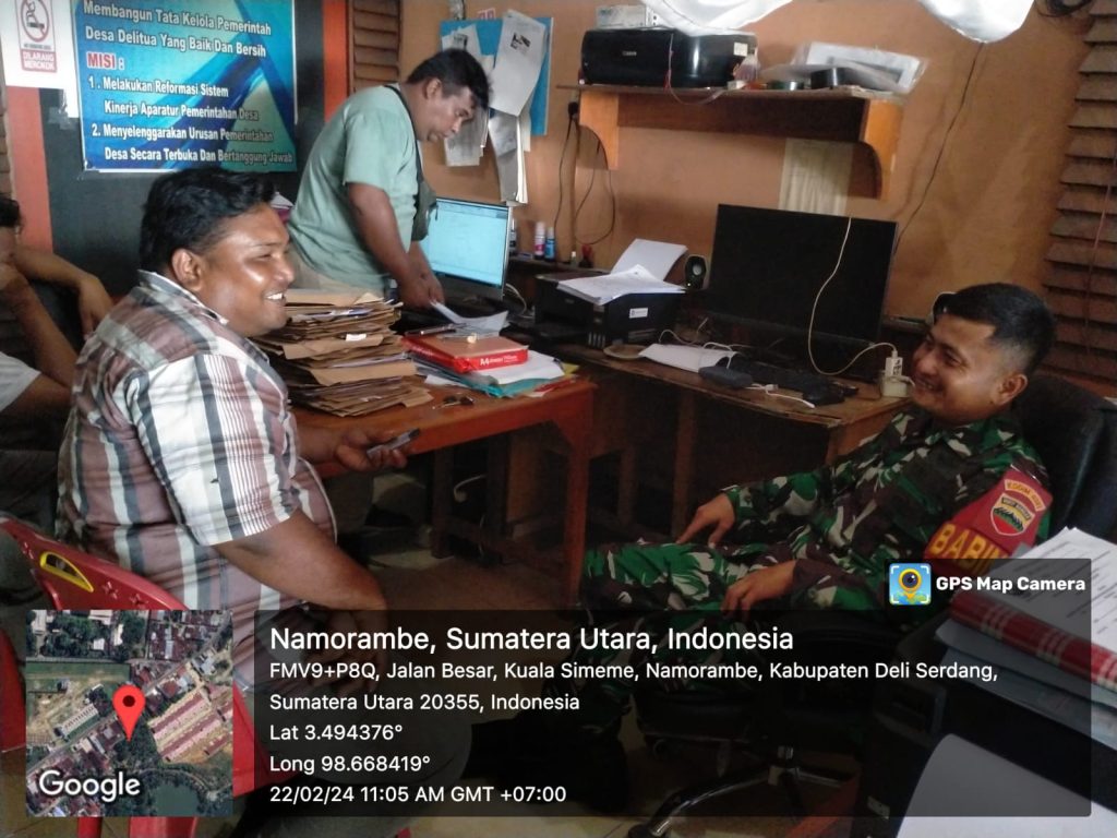 Namorambe – Untuk meningkatkan kerjasama yang baik dengan aparatur Desa di wilayah binaannya, Serda Ade Lingga Babinsa dari Koramil 14/PB Kodim 0201/Medan melaksanakan komunikasi sosial (Komsos) bersama aparatur pemerintahan Desa Deli Tua Kecamatan Namorambe, Kamis (22/2/2024).