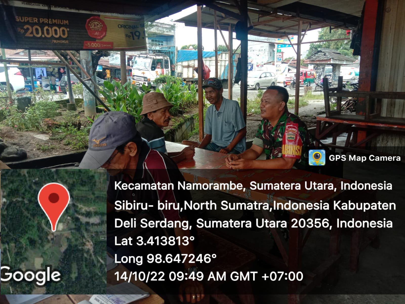 Karena itu, pada pagi hari ini (14-10-2022) salah seorang Babinsa Koramil 0201-14/PB yakni Sertu Asmadi terlihat melaksanakan kegiatan Komsos di wilayah Desa Namo Pinang Kec Namo Rambe, dengan menyambangi Tokoh Pemuda dan Tokoh Masyarakat yang bermukim di Dusun 1 Desa Namo Pinang Kec Namo Rambe. Kegiatan Komsos hari ini di laksanakan Sertu Asmadi guna memantau langsung kondisi keamanan dan ketertiban di lingkungan pemukiman warga Desa, termasuk juga untuk mengetahui informasi terbaru yang saat ini tengah berlangsung di seluruh wilayah Desa Namo Pinang.