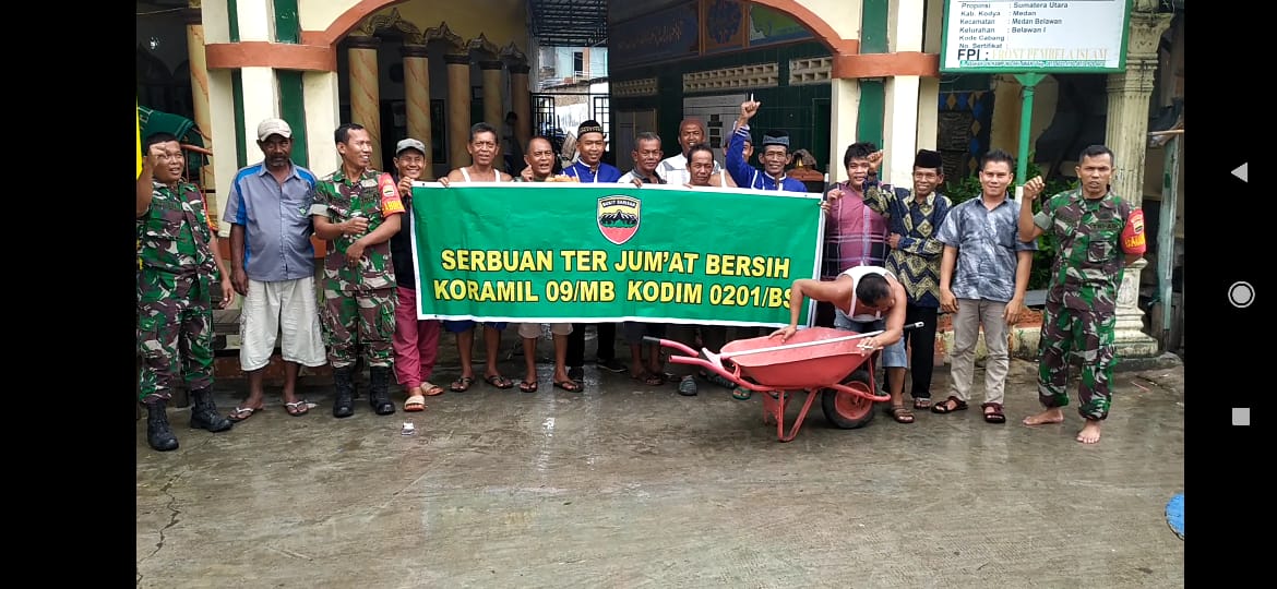 Pelaksanaan serbuan teritorial yang juga program Jumat Bersih, dilakukan di Masjid Nurul Falah, Jalan Serdang Ling XI, Kelurahan Belawan I, Kec Medan Belawan.
