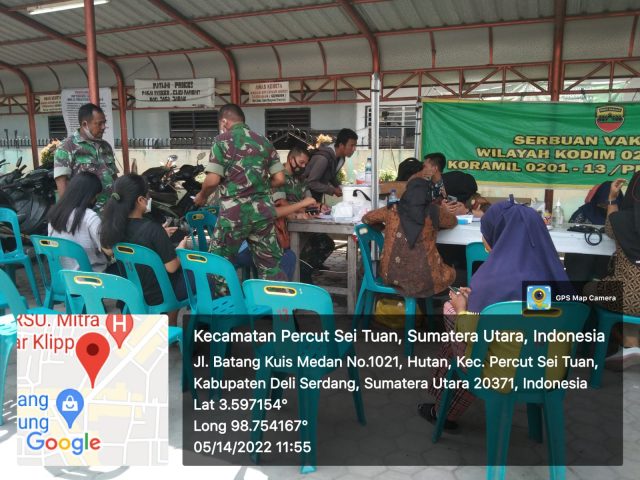 Bertempat di Halaman Masjid Al Firdaus Jln Besar Medan Batang Kuis Desa Bandar Klippa Koramil 0201-13/PST kembali mengadakan Serbuan Vaksinasi Kodam I/BB untuk Vaksin 1, 2 dan 3 Boster bagi seluruh warga wilayah Kodim 0201/Medan khususnya warga Kec Percut Sei Tuan. Sabtu (14/5/2022)
