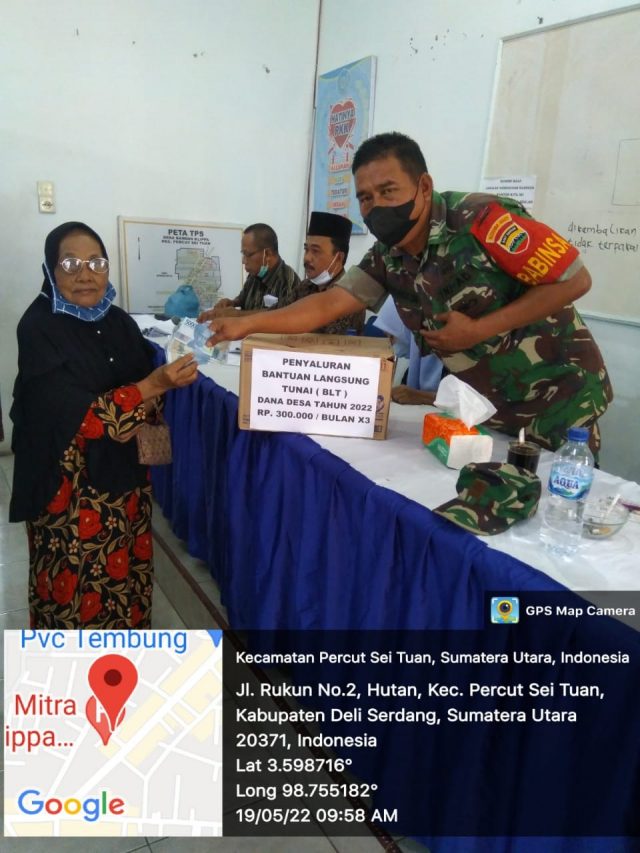 Babinsa Koramil 0201-13/PST wilayah binnaan Desa Bandar Klippa Serma Heriyandi Siko melaksanakan pendampingan pembagian Bantuan Langsung Tunai ( BLT ) tahun 2022 bertempat di Aula Kantor Desa Bandar Klippa, Kec Percut Sei Tuan. Kamis (19/5/2022)