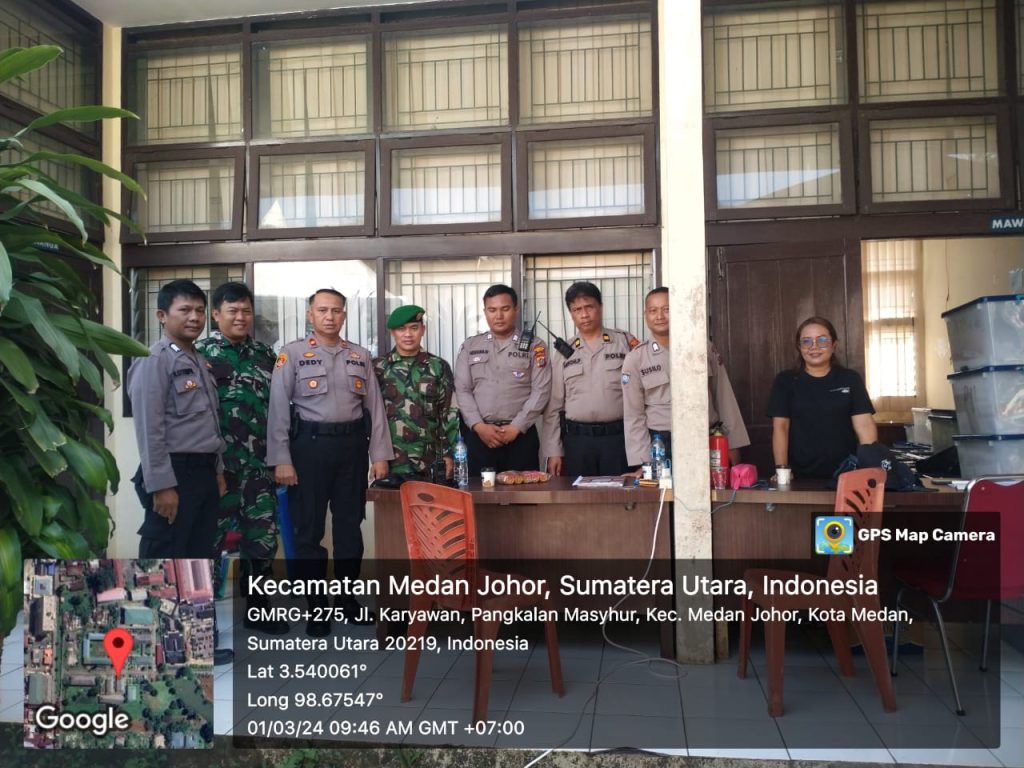 Medan : Anggota Koramil 0201-08/MA Kodim 0201/Medan Serka S.Sitopu dan Koptu M.Ridwan bersama anggota Polsek Delitua pada Hari Jumat 01 Maret 2024 melaksanakan pengamanan dalam pelaksanaan rekapitulasi hasil penghitungan suara tingkat PPK Medan Johor. Bertempat di Gedung Balai Pertanian Kota Medan, Jalan Karyawan, Kelurahan Pangkalan Mansyur, Kecamatan Medan Johor.