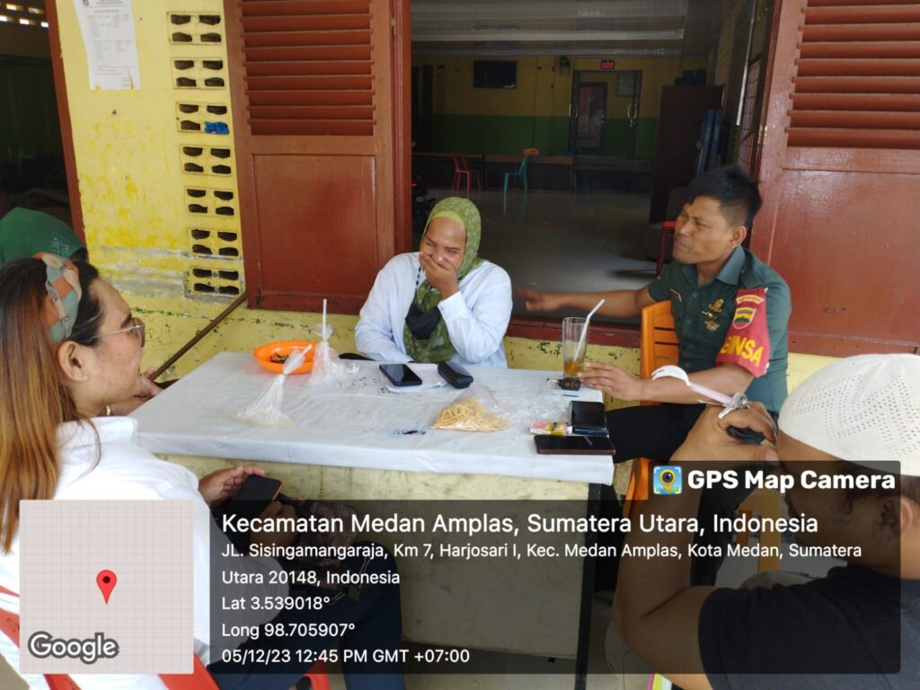 Medan : Babinsa Koramil 0201-08/MA jajaran Kodim 0201/Medan, Serda J.Sinaga mengawali kegiatan paginya dengan melakukan Komsos dengan Staf Kelurahan, bertempat di Kantor  Kelurahan Harjosari I, kecamatan Medan Amplas, Selasa 05 Desember 2023