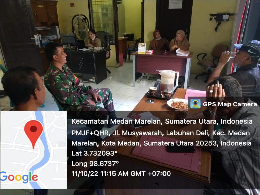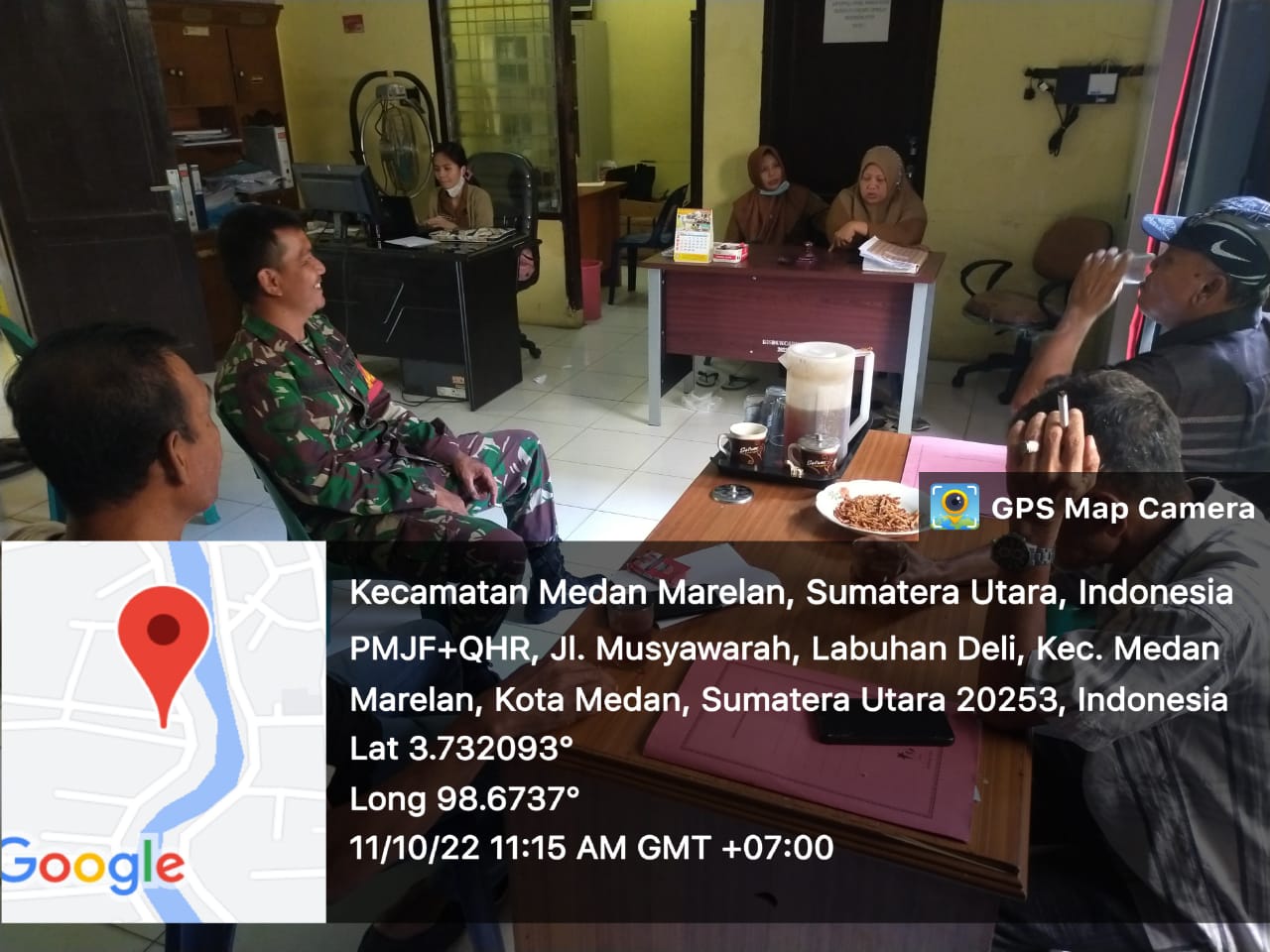 Medan Marelan – Babinsa Koramil 0201-10/Medan Marelan, Kodim 0201/Medan Serda Hamzah Efendi melaksanakan Komunikasi Sosial (komsos) dengan Seklur Labuhan Deli dan Staf Kelurahan, bertempat di kantor, Kel. Labuhan Deli, Kec. Medan Marelan. Selasa (11/10/2022)