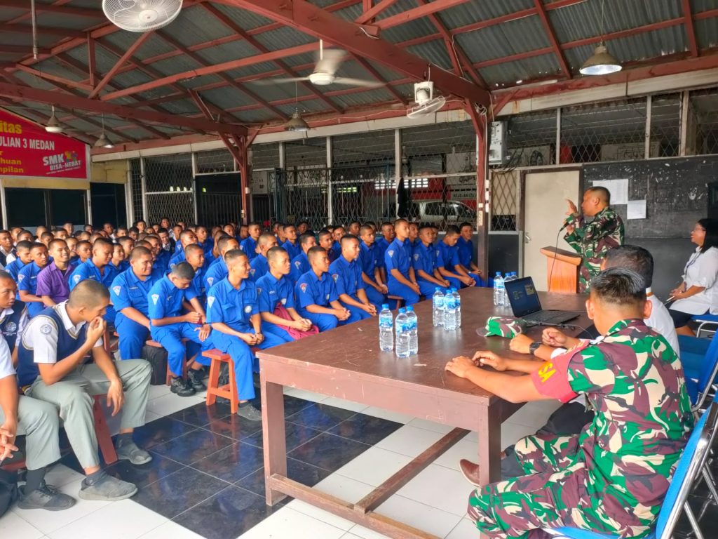 Danramil 0201-08/MA Kapten Arh Henry Johan Nainggolan Beserta Babinsa memberikan Wasbang kepada Siswa SMK Parulian 3 Medan tentang hindari Tawuran dan Jauhi narkoba, Senin (26/02/24).