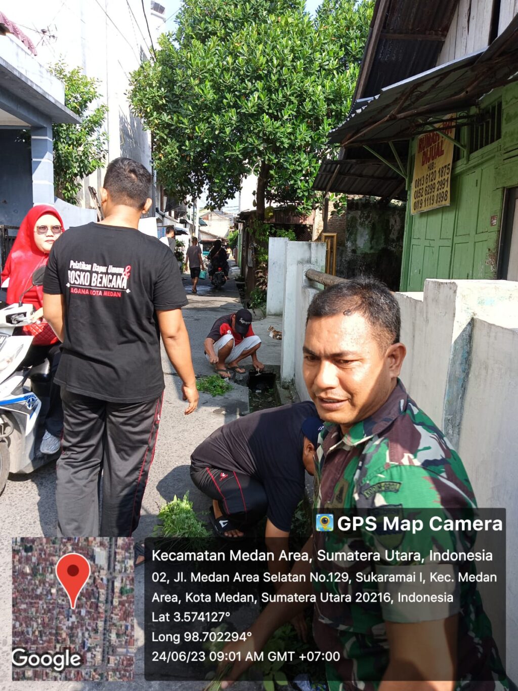 Dalam Rangka mewujudkan lingkungan bersih dan kepedulian terhadap kesehatan, Babinsa Koramil 0201-04/MK Sersan Choirul Anwar Siregar bergotong royong bersama Pak Lurah,perangkat kelurahan,kepling dan warga membersihkan jalan Medan Area Selatan gg.Pisang kelurahan Sukarai 1Kecamatan Medan Area. Sabtu (25/06/2023).